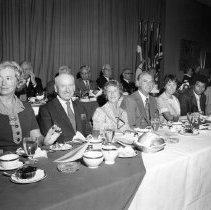 Digital Photograph, 1967. A B&W photograph of 7 people seated at the front table on stage at the 1967 induction events. L to R: Ellen Burka, Johnny Miles, unknown, Gary Cowan, Nancy Greene Raine, possibly Harry Jerome, and Earl McCready. They are eating dinner. Another row of people seated at a table are visible behind them.