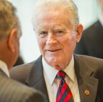 Colour photo. Hall of Famer Gary Cowan in conversation at the reception for Canada's Sports Hall of Fame 2016 Induction.