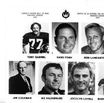 Digital photograph, 1985. A photo sheet featuring B&W headshots of the 1985 inductees. In the top row is Tony Gabriel, Hans Fogh, and Ron Lancaster. The bottom row has Jim Coleman, Ike Hildebrand, Jocelyn Lovell, and Sammy Luftspring. Their names are below each image. At the top is text which reads 'CANADA'S SPORTS HALL OF FAME HONOURED MEMBERS 1985' in English and French with the CSHoF logo between them.