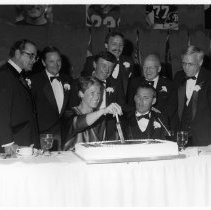 Digital photograph, B&W, 1985 Induction. An image of the group of 1985 inductees cutting a cake celebrating the 30th anniversary of induction. L to R: Sam Luftspring, Hans Fogh, Ike Hildebrand, Tony Gabriel, Jim Coleman, Ron Lancaster. Front centre: Sylvia Burka and Jocelyn Lovell. Images of the inductees hung on the wall are partially visible in the background.
