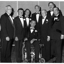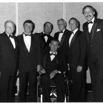 Digital photograph, B&W, 1985 Induction. The 1985 inductees posing for a photo. Left to right: Jim Coleman, Ike Hildebrand, Sam Luftspring, Ron Lancaster, Hans Fogh, Tony Gabriel (back row) and Jocelyn Lovell in the front. All of them have boutonnierres on their lapels.