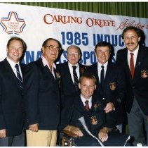 Digital photograph, colour, 1985 Induction reception. 1985 inductees posing for a photoLeft to right: Hans Fogh, Sam Luftspring, Jim Coleman, Ike Hildebrand, Tony Gabriel, and Jocelyn Lovell. All of them are wearing their induction jackets. They are standing in front of a banner for Carling O'Keefe Sports.