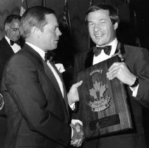 Digital photograph, B&W, 1985 Induction Ceremony. An image of inductee Hans Fogh receiving his induction plaque from Sport Minister Otto Jelinek. They are shaking hands and both hold onto the plaque with their other hand. Jelinek is smiling. Johnny Esaw is visible in the background at the podium.