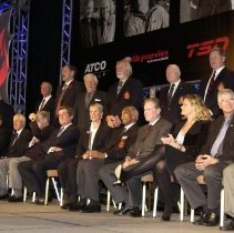 Digital photograph, colour, 2006 induction press conference. Group photo of Hall of Famers. Row 1, left to right: Jim Worrall, Johnny Esaw, Herb Carnegie, Robert Bedard, Julie Sauve, Jonathon Power, Ron and Marg Southern, Marie (sister of Moe Norman, representing him during induction), Elvis Stojko, Al Morrow, and Rick Hansen. Row 2, left to right: Maria Jelinek, Ron Ellis, George Gross, Sandra Post, Cliff Thorburn, Brian Glennie, Vic Hadfield, ...