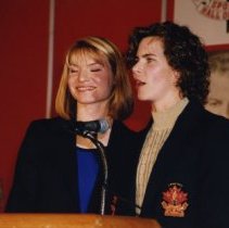 Digital Photograph,1997. A colour photograph of Kathleen Heddle (left) and Marnie McBean (right) giving their acceptance speech during the 1997 induction ceremony.