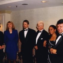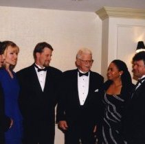 Digital Photograph,1997, colour. A candid photograph of the 1997 inductees chatting at the induction reception. Left to right: Marnie McBean, Kathleen Heddle, Larry Cain, Maury Van Vliet, a representative of Phil Edwards(daughter Gwendolyn 'Girija' Edwards), and Marcel Dionne.