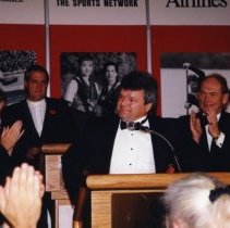 Digital Photograph,1997. A colour photograph of Marcel Dionne speaking at a podium during the 1997 induction ceremony. He is wearing his Honoured Member jacket. The people surrounding him are applauding.