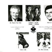 Digital Photograph,1997. A black and white photo sheet with images of the six inductees with their names printed below them. On the top row is Dr. Maury Van Vliet, Kathleen Heddle, Marnie McBean, and Marcel Dionne. In the centre is text that reads 'CANADA'S SPORTS HALL OF FAME 1997 INDUCTEES' in English and French. The bottom row has images of Larry Cain and Dr. Phil Edwards.