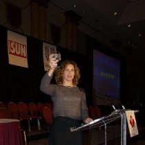 Photograph, colour, 2005 Canada's Sports Hall of Fame Induction Ceremony. Marnie McBean stands at a podium and gives a toast.
