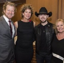 Colour Photo. An image of Hall of Famers Curt Harnett, Marnie McBean, country musician Brett Kissel, and Hall of Famer Elizabeth Manley posing for a photo at the 2017 Induction Festival VIP reception.